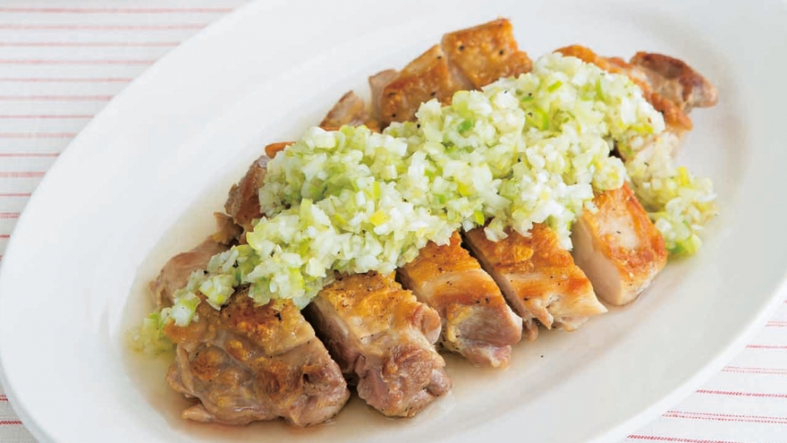 鶏もも肉のソテーは、皮側をじっくり、こんがりと焼くのが重要なポイント。ジューシーな鶏肉に、レモン汁入りのさっぱりとしたねぎ塩だれがよく合います。