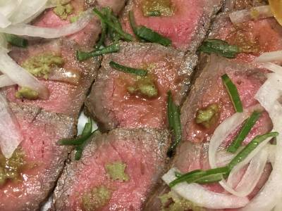 夏のお料理に、お薬味は欠かせません。にんにくやしょうがは抗菌作用もありますから、お刺身や、この牛たたきにもぜひお使いください。ほどよい刺激で、食がすすみますよ。
