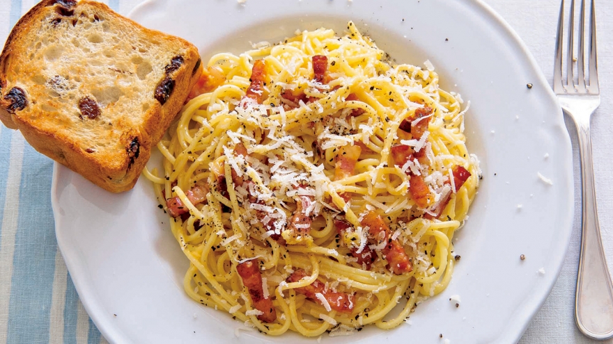 卵黄、すりおろしたチーズ、カリッと炒めたパンチェッタを、ゆでたてのパスタに手早く混ぜて仕上げます。1人分ずつボウルでつくると上手にできます。