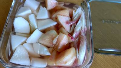 1を耐熱性の保存容器に入れ、2が熱いうちに注ぎ、粗熱を取る。ふたをして容器を軽く上下させ、液を行き渡らせる。