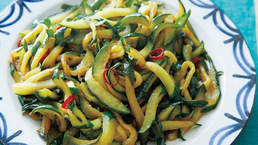 小さめのフライパンにごま油を中火で熱し、赤とうがらし、きゅうりを順に入れてサッと炒める。【A】を加え、汁けがなくなるまで5分間ほど炒める。