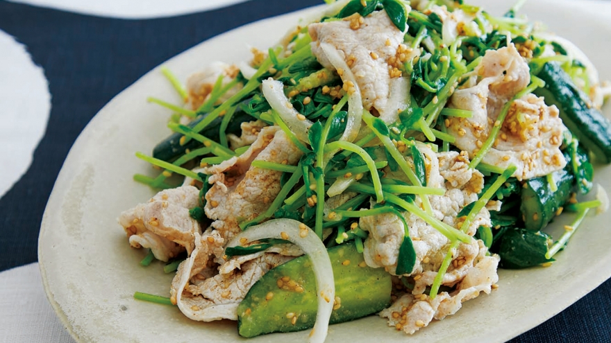 豚肉のしっとりと柔らかい口当たりに、豆苗のシャキシャキとした食感がアクセントになります。豆苗は、サッと湯通しする感覚で。