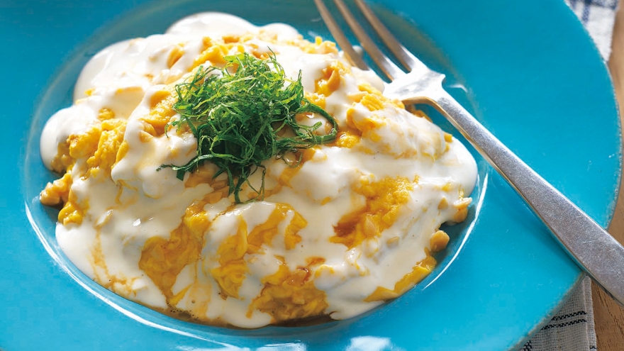 ヨーグルトを入れると加熱しても完全には固まらず、フワフワをキープできる。