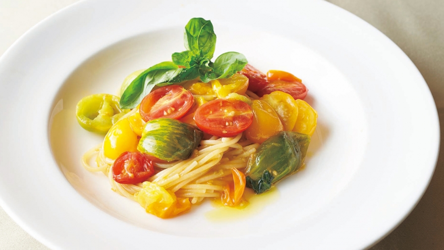 オリーブ油のコクにトマトの甘さと酸みがアクセント。いろいろなトマトが合わさってとってもジューシー!