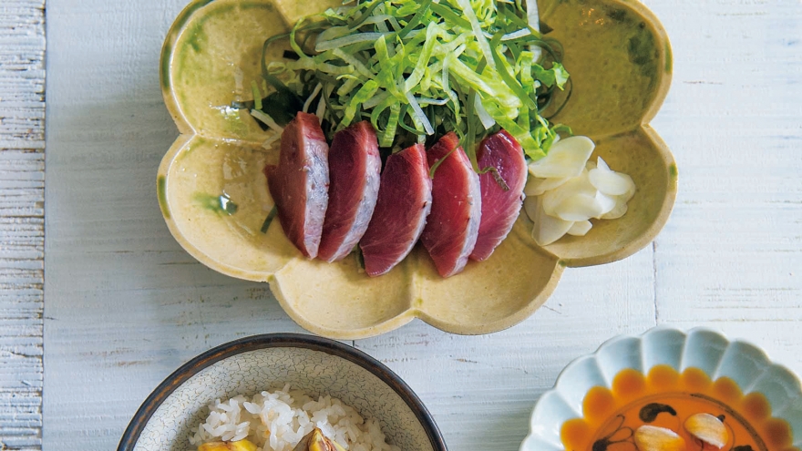 大根は5~6cm長さのせん切りにする。レタスは半分に切ってからせん切りにする。ともに氷水につけてパリッとさせ、水けをよくきって食べる直前まで冷蔵庫で冷やしておく。かつおは7~8mm厚さに切る。