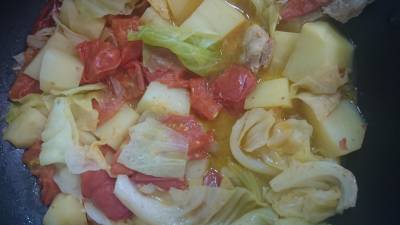 水を加えてふたをし、中火にかけて10分間ほど煮る。トマトが煮くずれしすぎないくらいのタイミングで火を止める。じゃがいもに少し芯が残っていたら、ふたをして約5分間蒸らす。