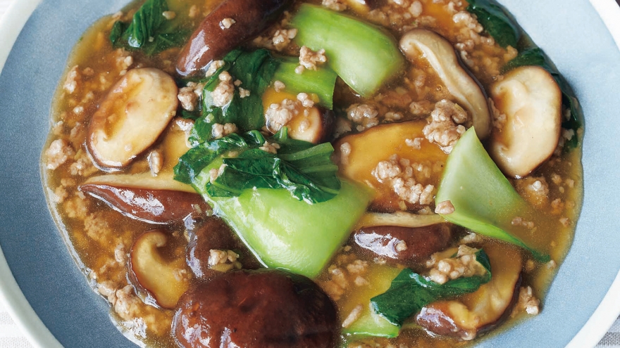 鍋にサラダ油、しょうが、ひき肉を入れて強火で炒める。色が変わったら、しいたけ、チンゲンサイを加えて炒め合わせ、ふたをして1分間蒸し焼きにする。