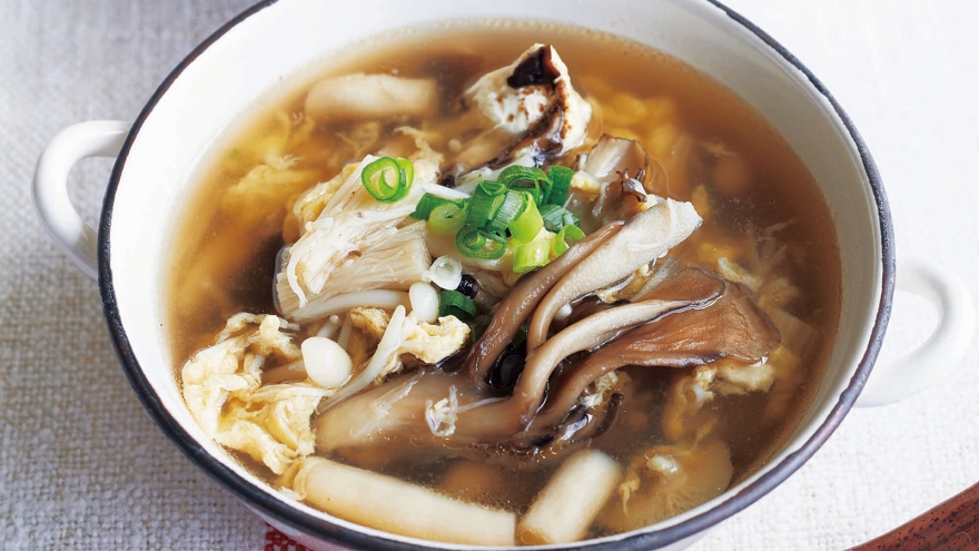 3種類のきのこと帆立て貝柱のうまみが掛け合わさった絶品スープです。帆立てとえのきを先に煮て、うまみをしっかり出すのがポイント。