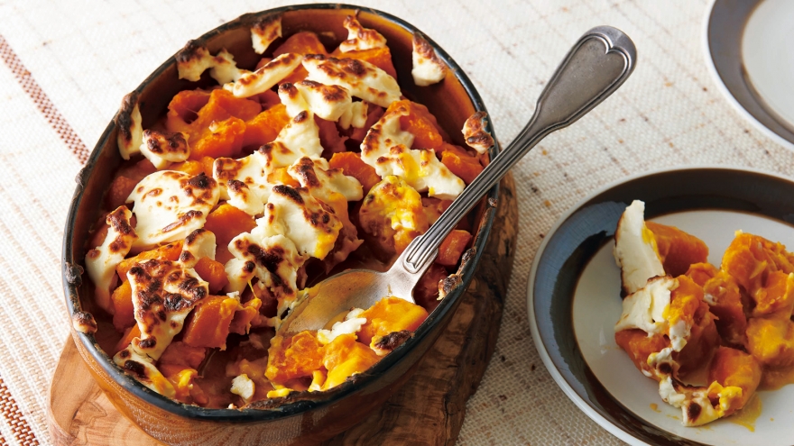 かぼちゃをバターとミルクでこっくりと煮てから、クリームチーズをのせてオーブントースターで焼くだけです。ほんわりとした甘さと爽やかなチーズの相性は抜群!