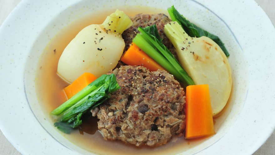 かぶと肉だんごを焼いて煮ることにより、煮くずれを防ぎます。かぶの実と葉は、カルシウムがあり、吸収を助けるビタミンK(葉)、D(しめじ)、たんぱく質(牛肉)と一緒に摂ることで骨粗しょう症の予防につながります。