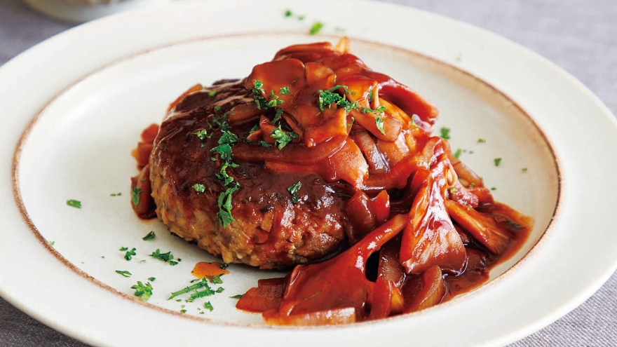 ハンバーグを器に盛って【ソース】をかけ、パセリをふる。