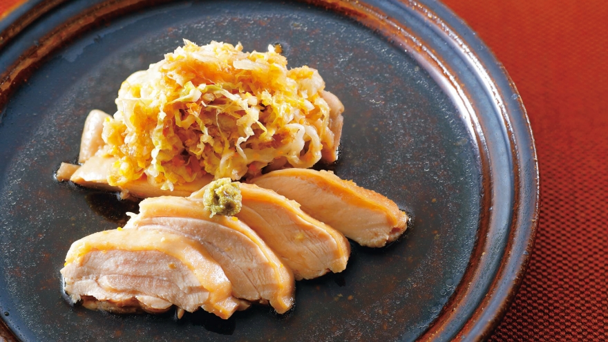 鶏もも肉でつくる、しっとりジューシーな鶏ハムです。白菜、ねぎ、しょうがなど、秋冬においしい野菜のうまみと香りがたっぷり詰まった“和の香りだれ”と楽しんで。