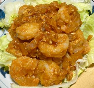 プリップリのえびに、特製のチリソースをまとわせて。辛さのなかにも香りと甘みがあります。