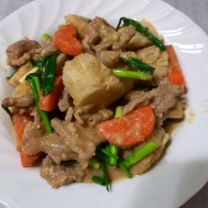 豚肉に火が通ったら、にんじんは蒸し汁ごと加え、里芋も加えて2~3分間煮る。