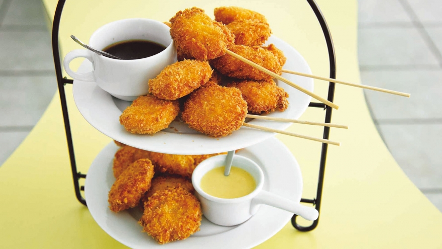 人気のチキンナゲットを気軽に手づくり。細かくたたいた鶏むね肉を使うから、あっさりしていて、外はサクサク、たまねぎの歯ざわりもきいています。2種類のパン粉と2つのたれで、いろいろなおいしさが楽しめます。