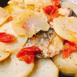 じゃがいもは5~6㎜厚さの輪切りにする。ミニトマトはヘタを除き、2等分に切る。たらは紙タオルで水けを拭き、半分に切って骨を除く。
