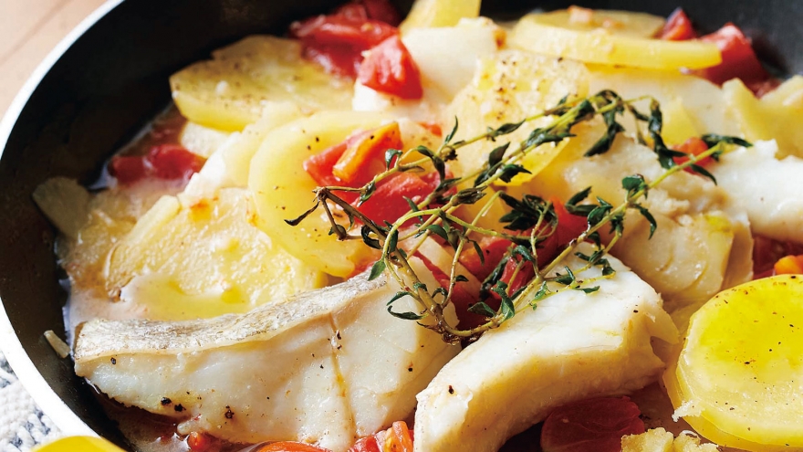 たらの上にじゃがいも、ミニトマトを広げてのせ、にんにくを散らしてタイムをのせる。白ワインを回しかけ、水大さじ2~3を加え、煮立ったらふたをして6~7分間、じゃがいもが柔らかくなるまで蒸し煮にする。