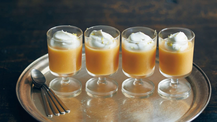 ホイップクリームをつくる。ボウルに生クリーム、きび糖を入れ、底を氷水に当てながら柔らかく泡立てる。4の上にのせ、レモンの皮を散らす。