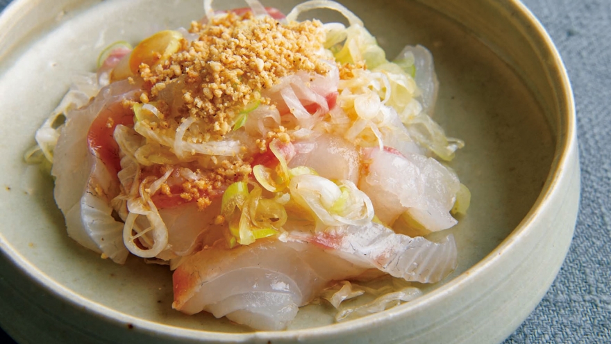 刺身は薄いそぎ切りにし、ねぎ塩を加えてあえる。