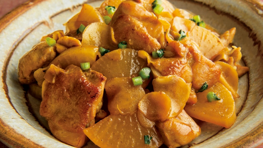 鶏肉と大根に焼き目をつけてから煮ることで香ばしく、大根は程よい歯ごたえに。