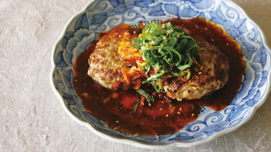 肉ダネに刻んだ牛カルビ肉を混ぜた、ちょっとぜいたくなハンバーグ。かみしめるたびに、肉のうまみがジュワッと広がります。焼き肉のたれとキムチを合わせた韓国風のたれがよく合います。