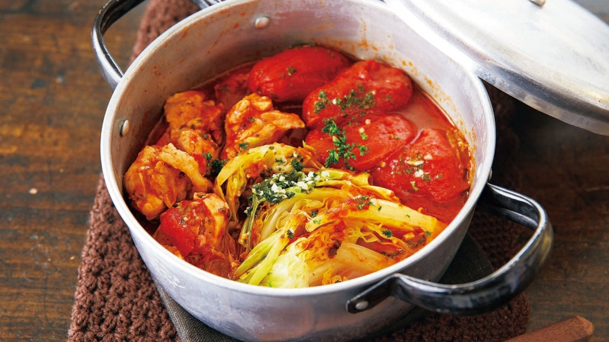 鍋に1のキャベツと鶏肉、トマトの水煮を入れ、【A】を回しかける。中火にかけ、煮立ったらすぐに弱火にし、ふたをして、約15分間蒸し煮にする。途中、焦げつかないよう、火加減に注意する。