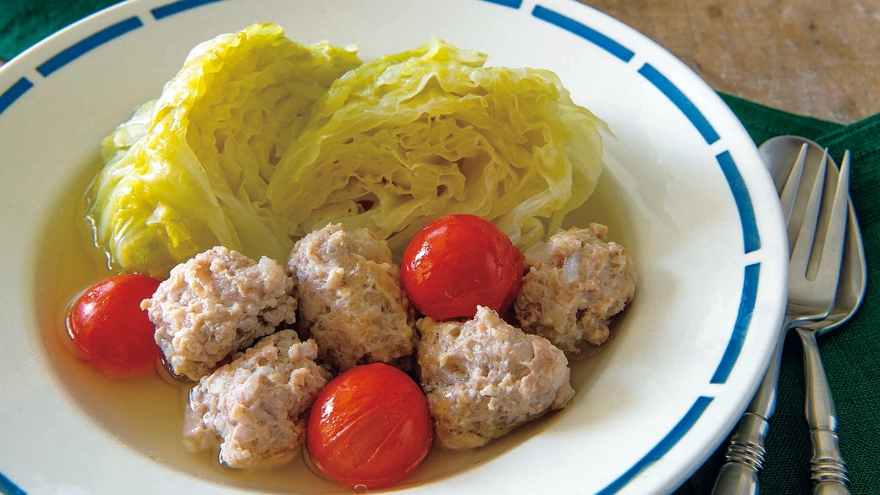 春キャベツを外葉から軸や芯まで一緒に煮た、シンプルなスープ煮です。鶏だんごのうまみが詰まった煮汁ごと楽しんで。