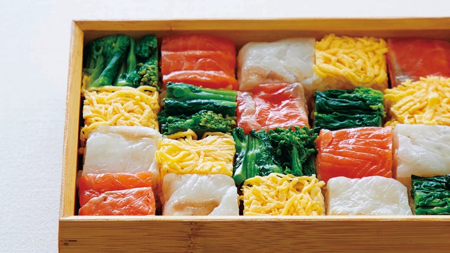 たいとサーモンは軽く塩をふって10分間おき、水けを拭いて酢にサッとくぐらせる。菜の花は水カップ2に塩小さじ2を加えた湯でゆで、冷水に放す。水けを絞り、半分に切る。【薄焼き卵】はせん切りにし、錦糸卵にする。