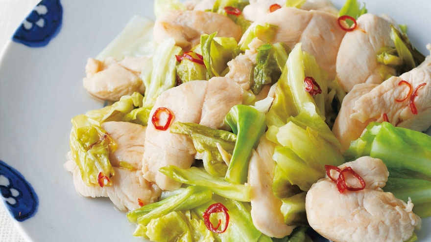 シャキシャキに炒めたキャベツと甘酢が好相性。ささ身はそぎ切りにして断面を広くして、甘酢をよくからめて。