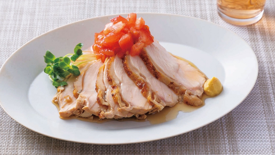 表面だけ焼いた鶏肉を熱い煮汁につけるだけで、あとは時間がおいしくしてくれます。しっとり柔らかな鶏ロースです!