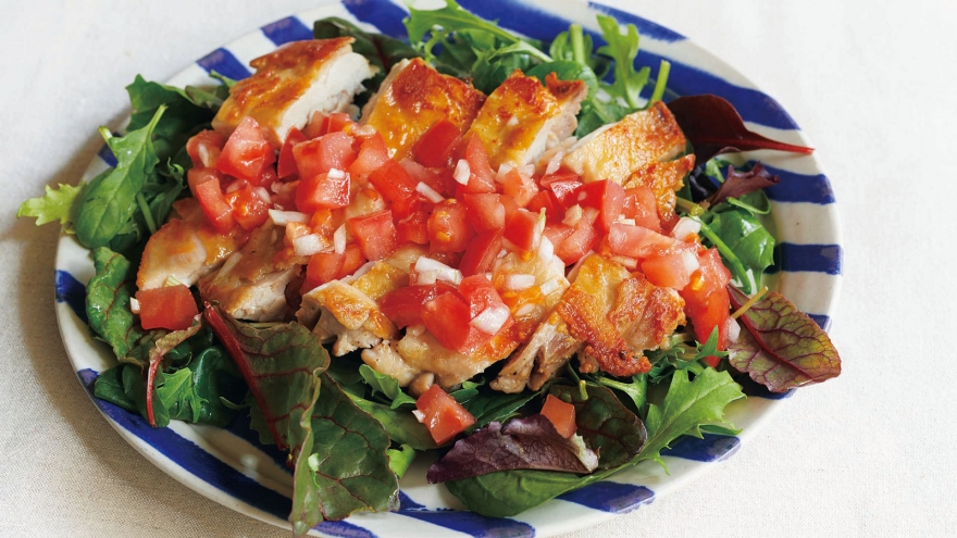 2のボウルに3のトマト、【トマトソース】の残りの材料、1で肉を休ませたときに出た肉汁を入れて混ぜ合わせる。器にベビーリーフを広げ、鶏肉を食べやすい大きさに切ってのせ、【トマトソース】をかける。