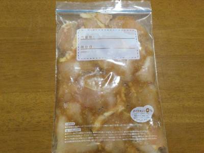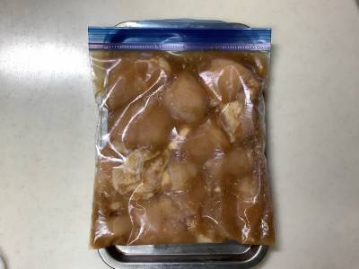 冷凍用保存袋に鶏肉を入れ、【A】を加えてよくもみ込み、平らにして空気を抜き、冷凍庫に入れる。