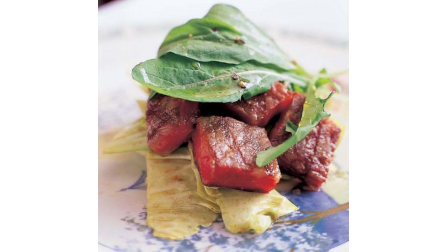 皿に2のキャベツを盛り、上に4のステーキをのせる。ルッコラの葉をのせ、粗びきこしょうをふり、仕上げる。