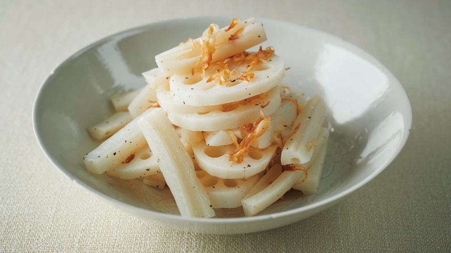 2のフライパンをきれいにして、ねぎとごま油を入れ、弱火でじっくりと炒める。ねぎの水分がとんできつね色になり、香ばしい香りが出たら、2のれんこんにかけてあえる。器に盛り、黒こしょうをふる。