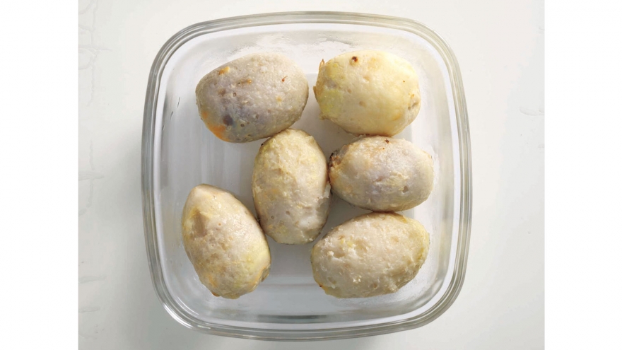 里芋はよく洗い、耐熱皿に入れてふんわりとラップをする。電子レンジ(600W)に13分間かけ、取り出してそのまま3分間蒸らす。