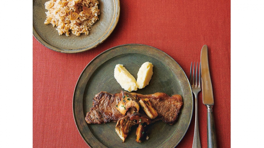 器に5のステーキを盛り、好みで【じゃがいものピュレ】、【きのこのソテー】を添える。別の器に7のガーリックライスを盛り、6のにんにくをのせる。