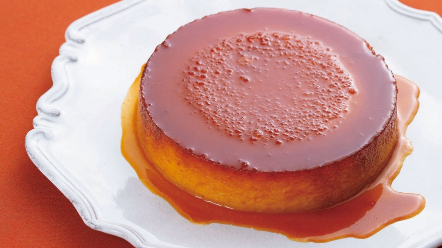 天板に深めの耐熱バットを置き、中央に8をのせる。人肌くらい(40℃弱)に温めた湯を型の約1/3くらいの深さまで注ぐ。160℃に温めたオーブンで35~40分間蒸し焼きにし、さらにオーブンに入れたまま30分間ほどおく。オーブンから出して常温で冷まし、型ごと冷蔵庫で冷やす。
