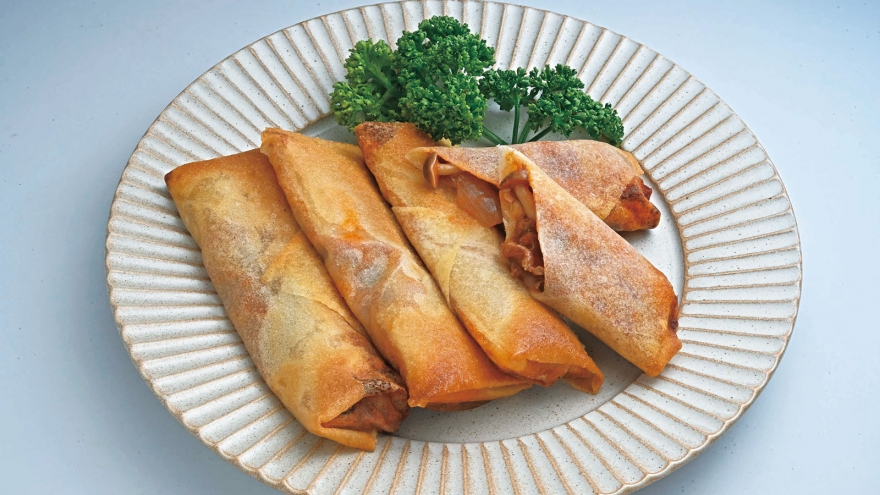 つくりおきした「たっぷりきのこのデミグラス風煮込み」を凍ったまま包んで揚げるだけ!こんな春巻きの具もアリ。