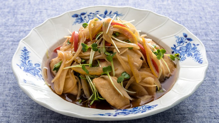 フライパンにサラダ油を熱し、鶏肉を弱めの中火で焼き色をつけずに焼く。熱いうちに2に加えて漬け込み、そのまま1時間以上おいて味をなじませる(粗熱を取り冷蔵庫に入れても良い)。長さを半分に切った貝割れ大根を混ぜ、器に盛る。