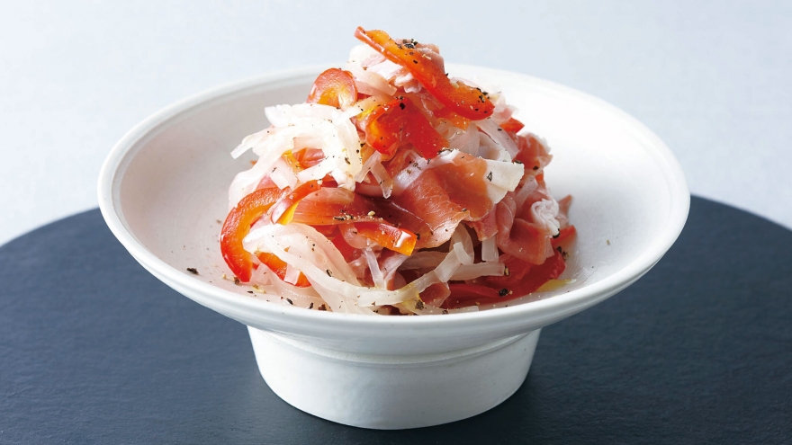 甘酸っぱいなますとしょっぱい生ハムは絶妙のとり合わせ。オリーブ油をかけてまろやかに仕上げます。