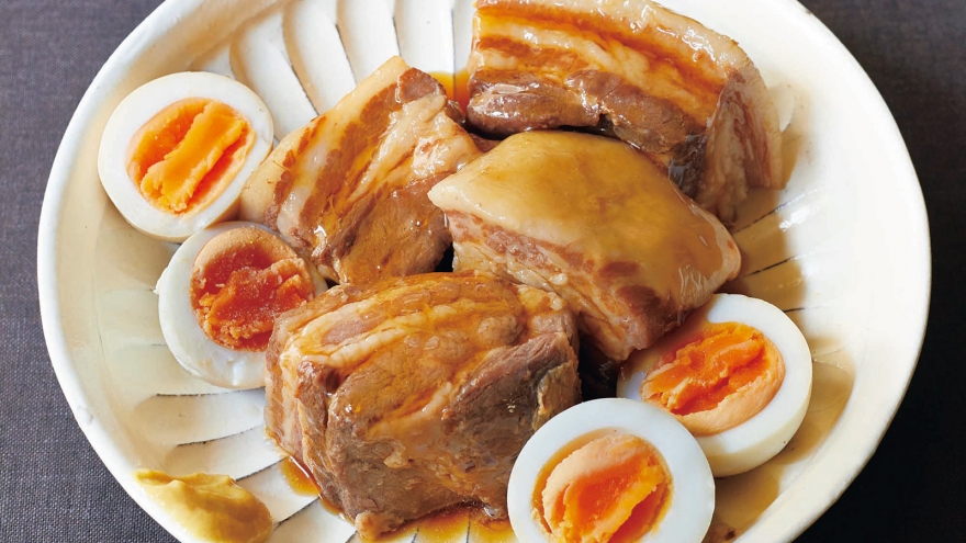 白く固まった脂ごとラップをそっとはがす。ねぎ、しょうがは取り除き、卵は取り出す。鍋を中火にかけ、角煮が温まったら器に盛る。