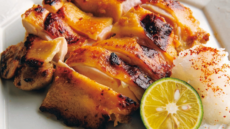 もも肉についた【みそだれ】をしっかり拭き取る。フライパンにサラダ油を弱火で熱し、もも肉を皮を下にして入れ、2分間ほど焼く。焼き色がついたら裏返し、1~2分間焼く。一口大に切って器に盛り、大根おろしとすだちを添え、大根おろしに一味とうがらしをふる。