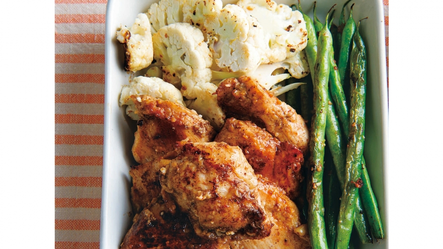 むね肉は縦半分に切り、繊維に沿って一口大に切る。【塩麹スパイスだれ】の材料を混ぜ合わせ、むね肉とともにポリ袋に入れてからませる。空気を抜き、30分間以上室温におく。さやいんげんはヘタを取り、カリフラワーは1.5cm厚さに切る。