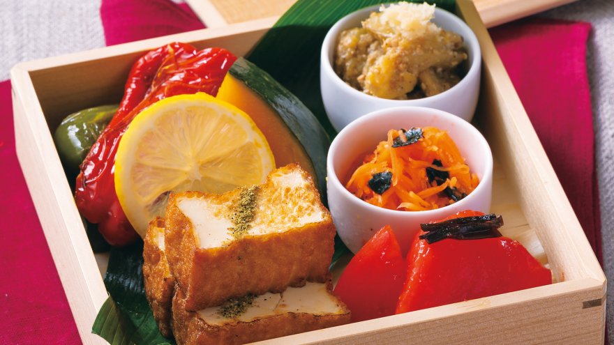 焼いた厚揚げ、にんじんの梅のりあえ、トマトの塩昆布あえ、ピーマンの丸ごと焼き、かぼちゃのはちみつレモン煮、なすのレンチンごまあえを器に盛る。