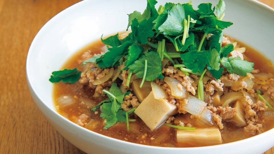 高野豆腐をメインのおかずにしたいと考えた一品です。だしで煮含めた高野豆腐に鶏そぼろとたまねぎのあんをたっぷりかければ、食べごたえのあるごちそうに。