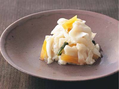 小かぶは皮を厚めにむき、薄い輪切りにする。昆布は【つけ酢】に浸し、柔らかくしておく。柿は皮をむいて短冊形に切り、約1%の塩水に約3分間放す。