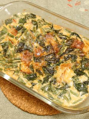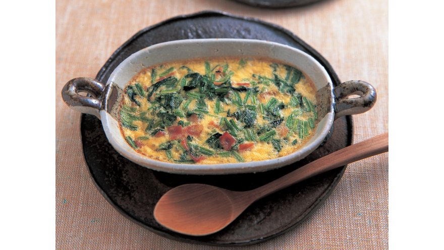 ほうれんそうとベーコンのソテーを、だしで溶いた卵でとじてオーブンで焼く和風グラタン。卵に混ぜた溶かしバターが香りよく、ほんのりとした甘い味わいを出します。