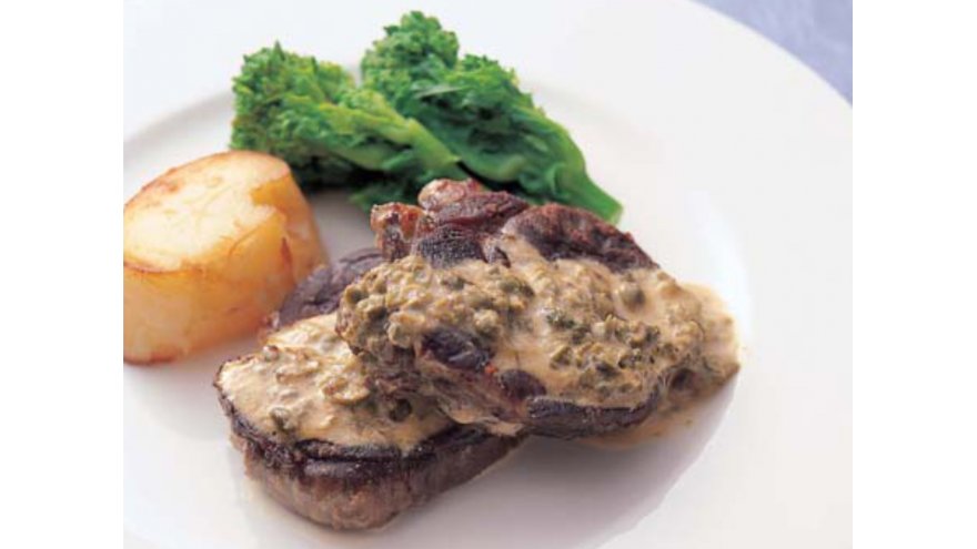軽い酸味のあるサワークリームソースをかけた、ステーキ風の一皿です。食べごたえのある牛すね肉がたまりませんよ。