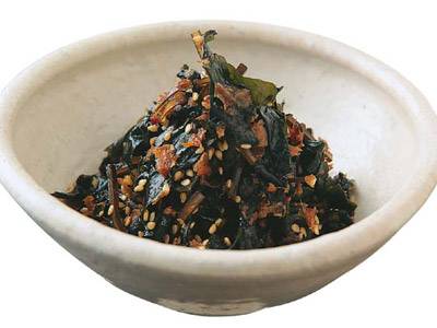 捨ててしまうにはもったいない、だしをとった昆布と削り節。わかめを加えて、つくだ煮に。