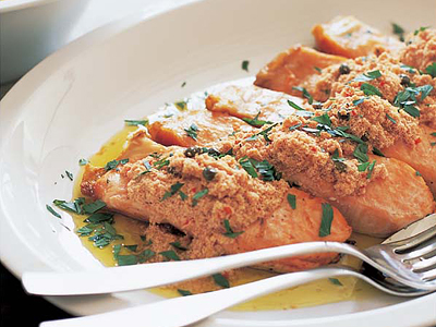 サーモンにのせたパリパリのたらこのソースは、シチリア島のからすみそっくりの風味。つけあわせのパスタにもからめて召し上がれ。